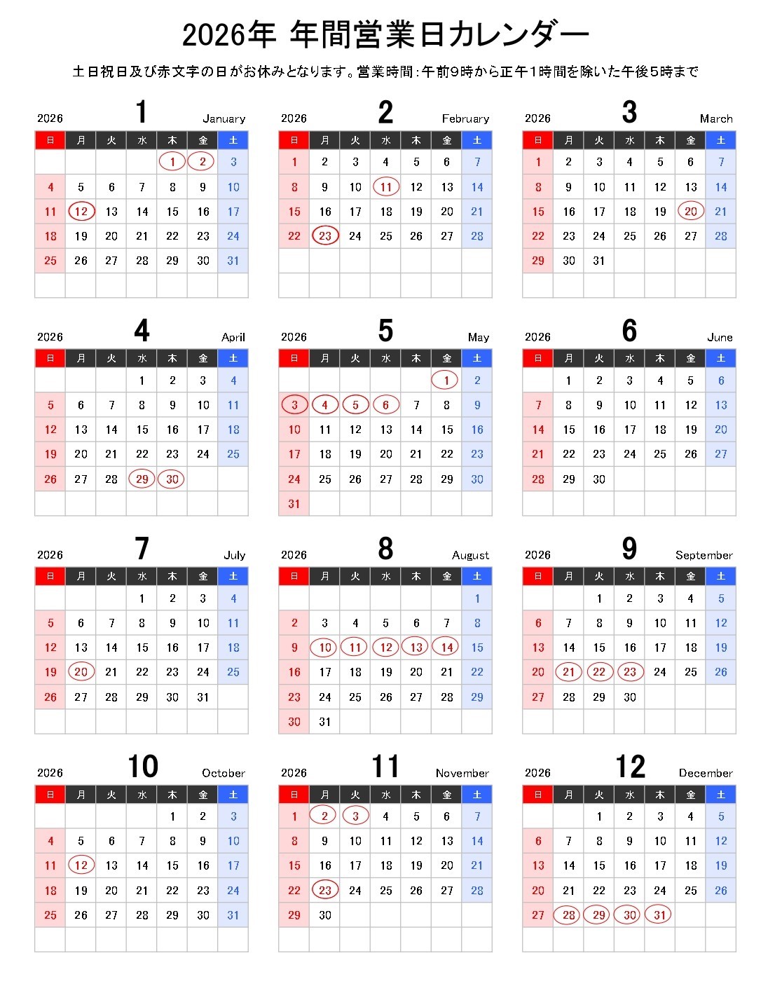 営業時間 平日 午前9時から正午1時間を除いた午後5時まで